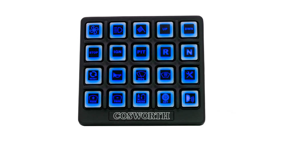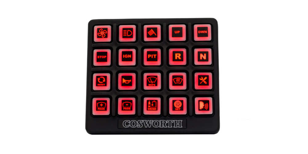 The Cosworth Rubber Switch Panel (RSP) is a fully customisable rubber switch panel supporting up to 20 momentary push button switches in a variety of combinations, with tricolour LED status illumination on each switch.